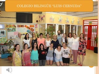 Este documento presenta la información sobre el horario, la comunidad escolar, las instalaciones, los programas y las actividades del Colegio Bilingüe "Luis Cernuda". El horario incluye una jornada continua de 9:00 a 14:00, con comedor y estudio vigilado hasta las 16:00. La comunidad escolar está formada por 193 alumnos y 15 profesores. El colegio ofrece programas de bilingüismo, atención a la diversidad, y actividades extraesculares como música, teatro e idiomas.