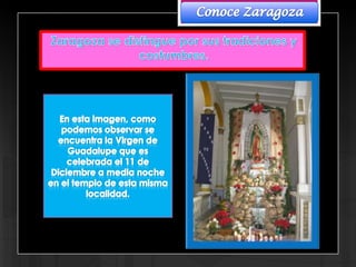 Este documento presenta información sobre la ciudad de Zaragoza en el estado de Veracruz, México. Describe algunas tradiciones como los altares de Día de Muertos y la corona de Adviento. También describe el mercado local donde se pueden encontrar tiendas de dulces, ropa y carnicería. Finalmente, menciona que Zaragoza tiene escuelas desde preescolar hasta preparatoria y una abundante flora y fauna que se puede observar en los paisajes cercanos.
