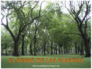 El documento detalla las características y funciones de las plantas, incluyendo su capacidad para realizar la fotosíntesis y la reproducción a través de flores. Describe las partes de las plantas como raíces, tallos y hojas, así como las diferencias entre tipos de tallos y hojas. También expone el proceso de polinización y la formación de semillas y frutos.