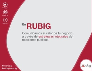 Rubig Inc. ofrece estrategias integrales de relaciones públicas que se adaptan a cualquier sector comercial. Su enfoque consiste en interactuar de manera efectiva para aumentar el éxito de los proyectos, colaborando con equipos internos y utilizando un método estructurado. La empresa se posiciona como aliada del crecimiento de sus clientes mediante la implementación de modelos de interacción personalizados.
