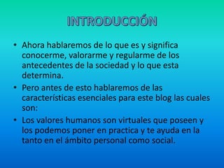 Este documento habla sobre la importancia de conocerse a uno mismo, valorarse y regularse durante la adolescencia. Explica que durante esta etapa hay muchos cambios y decisiones importantes, por lo que es necesario desarrollar una buena autoestima. También destaca la importancia de establecer metas y un proyecto de vida, así como aprender a aceptarse a uno mismo. El objetivo final es brindar información útil a los jóvenes para que puedan desarrollarse plenamente.