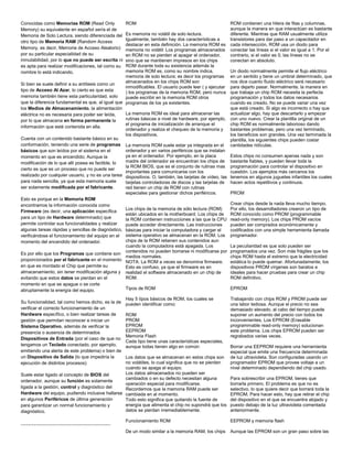 La memoria ROM es memoria de solo lectura que almacena información de forma permanente. Contiene programas básicos que se leen al encender el sistema para verificar el funcionamiento del hardware. A diferencia de la RAM, la ROM no necesita alimentación eléctrica para retener la información.