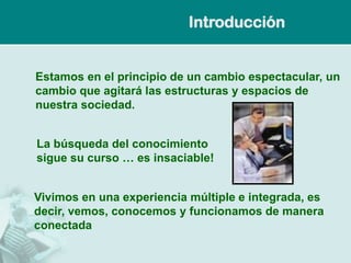Este documento explora las teorías del conocimiento y el aprendizaje. Discuten que el conocimiento ya no es estático sino dinámico y se crea a través de redes de conexiones. El aprendizaje ocurre a través de la formación de estas redes entre personas, información y herramientas. También analiza cómo el contexto, contenido y canales a través de los cuales se accede al conocimiento están cambiando, descentralizando el conocimiento y haciéndolo más emocional y creativo.