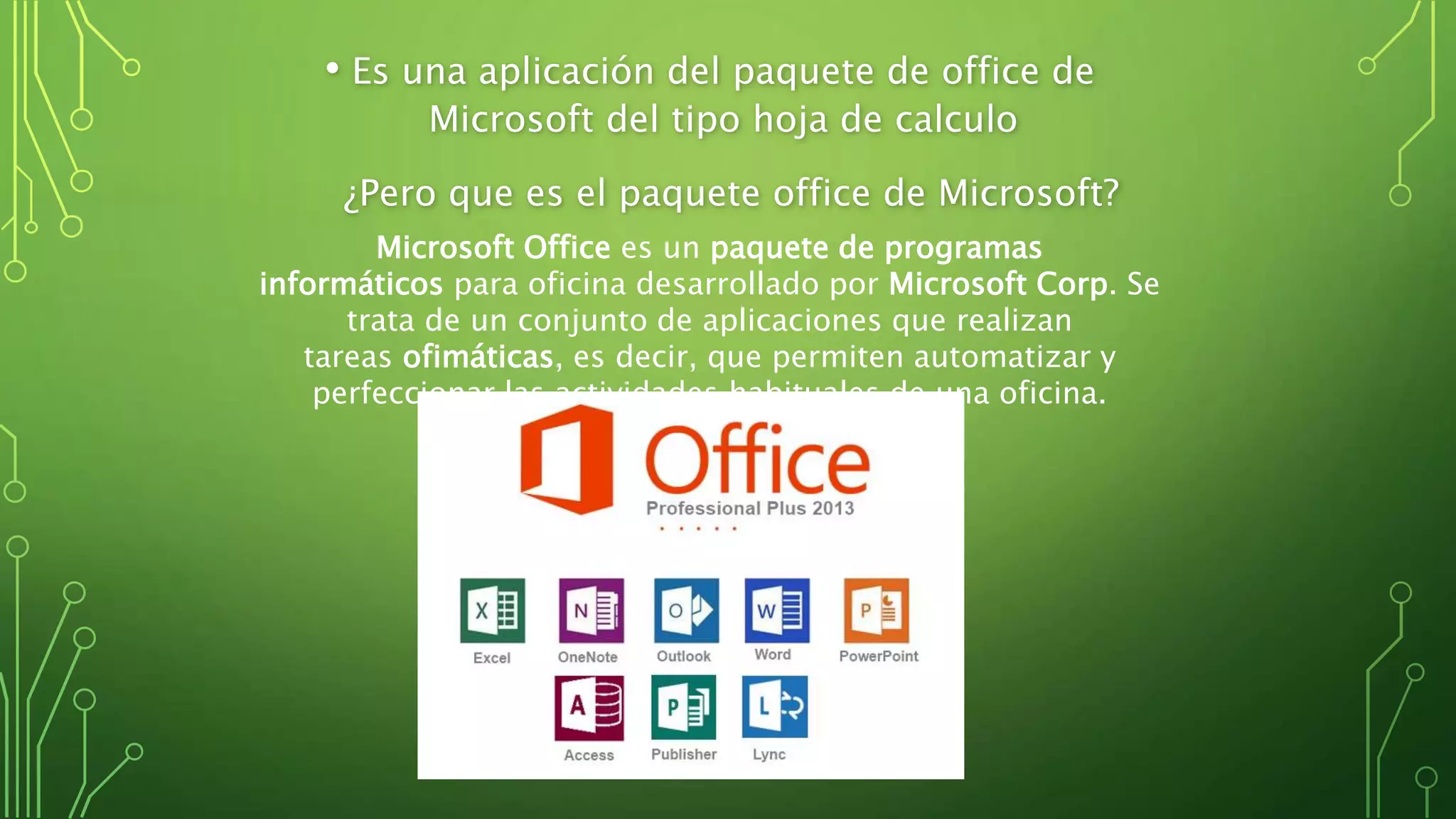 Excel es una aplicación de hoja de cálculo del paquete Microsoft Office que permite realizar cálculos y gestionar datos. Dispone de herramientas para analizar, compartir y presentar información a través de funciones, gráficos y tablas dinámicas. La interfaz incluye elementos como la banda de opciones, barra de fórmulas y barra de estado, facilitando la administración de archivos y la visualización de datos.