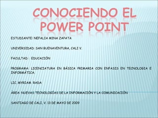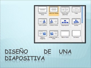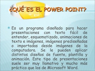 El documento describe las funciones básicas de Microsoft PowerPoint, un programa de presentaciones que permite crear diapositivas con texto, imágenes, gráficos y animaciones. PowerPoint facilita la organización y presentación ordenada de contenidos a través de diapositivas que se despliegan secuencialmente en la pantalla. El programa incluye galerías de plantillas, diseños y efectos de animación para facilitar la creación de presentaciones atractivas y efectivas.