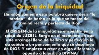 La iniquidad, entendida como maldad, impiedad y culpa, tiene su origen en la rebelión de Luzbel y se manifiesta tanto a nivel personal como familiar y congregacional, provocando maldiciones. Este documento enfatiza su gravedad, comparándola con la idolatría y la desobediencia, y destaca la necesidad de buscar redención a través de Jesucristo. Además, menciona que la iniquidad puede ser transmitida entre generaciones y que quienes la permiten o practican pueden enfrentar el juicio de Dios.