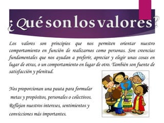 Este documento describe los valores como principios que guían el comportamiento humano y ayudan a las personas a alcanzar la realización personal. Define diez valores fundamentales: amistad, amor, solidaridad, honestidad, compromiso, responsabilidad, perseverancia, generosidad, respeto y tolerancia. Concluye que practicar estos valores permite a las personas valorarse a sí mismas y aceptar a los demás.