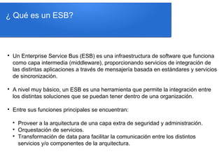 Mule ESB es un bus de integración empresarial diseñado para facilitar la interconexión de aplicaciones y servicios dentro de una organización mediante mensajería estandarizada. Destaca por su configuración sencilla, extensibilidad, y su cumplimiento con estándares abiertos, lo que lo hace menos costoso y más práctico que otras soluciones. Con más de 2 millones de descargas y amplia adopción en implementaciones críticas, se posiciona como un producto visionario en el cuadrante mágico de Gartner.