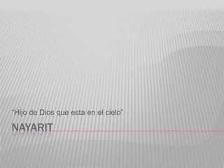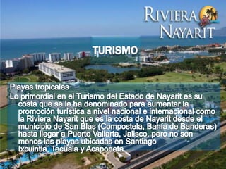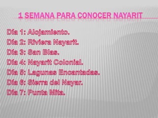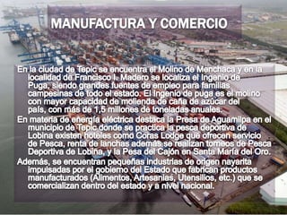 El documento proporciona información estadística y datos históricos sobre el estado de Nayarit en México. Algunos detalles clave incluyen que Nayarit tiene una población de alrededor de 1.085 millones de personas, la mayoría de los cuales viven en áreas urbanas. Los grupos indígenas principales son los Coras y Huicholes. El documento también resume eventos históricos importantes como la conquista española en el siglo XVI y la conversión de Nayarit en un estado independiente en 1917.