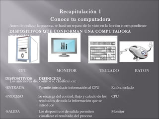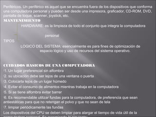 Este documento describe los componentes principales de una computadora personal y sus funciones. Explica que una computadora está compuesta por una unidad central de procesamiento (CPU), monitor, teclado, ratón y otros dispositivos de entrada, proceso y salida. También describe los cuidados básicos para mantener una computadora en buen estado y limpiar sus componentes internos y externos de manera segura.