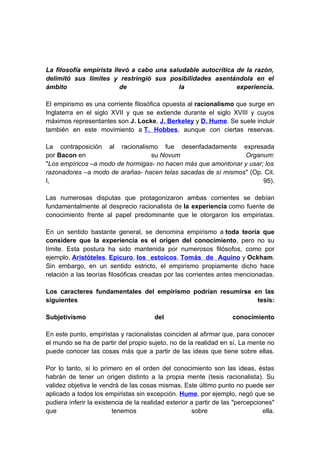 El documento describe los métodos de investigación empírica y el empirismo como corriente filosófica. Explica que el conocimiento empírico se basa en la experiencia y percepción, mientras que el empirismo considera que toda experiencia proviene de los sentidos. Las principales características del empirismo incluyen que la experiencia es la única fuente de conocimiento, que la mente no tiene ideas innatas y que los conceptos universales solo son nombres para conjuntos de percepciones. El documento también destaca la importancia del método experimental y la verific