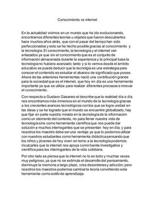 El documento discute la relación entre el conocimiento, la tecnología y Internet. Explica que el conocimiento y la tecnología se han desarrollado conjuntamente a lo largo del tiempo y que Internet ahora sirve como una importante herramienta para innovar el conocimiento e interconectar ideas. También argumenta que los maestros pueden usar la tecnología y Internet como herramientas didácticas para apoyar el aprendizaje de los estudiantes.