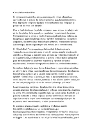 El documento trata sobre el conocimiento científico. Explica que el conocimiento científico es una aproximación crítica a la realidad que busca explicar las cosas desde lo esencial hasta lo más complejo. También define conocimiento como la acción y efecto de conocer a través de las facultades. Finalmente, discute diferentes puntos de vista sobre el origen, valor y objetivo del conocimiento científico según diferentes filósofos y escuelas de pensamiento.