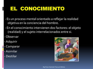 Este documento describe los diferentes tipos y niveles de conocimiento. Explica que el conocimiento puede ser sensible, conceptual o holístico. También distingue entre conocimiento científico, empírico, filosófico, ideológico y artístico. Además, describe los elementos del conocimiento científico como los hechos, hipótesis, leyes y teorías.