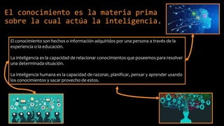 El documento describe los conceptos fundamentales de conocimiento e inteligencia artificial. Explica que el conocimiento es la materia prima sobre la cual actúa la inteligencia y que existen diferentes tipos de conocimiento como el procedimental, declarativo y heurístico. Además, detalla cómo se representa el conocimiento en organismos biológicos, computadoras y seres humanos y proporciona ejemplos de aplicaciones de la inteligencia artificial como la asistencia sanitaria, educación y finanzas.