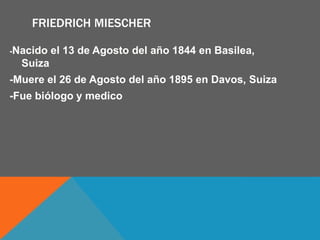 Friedrich Miescher aisló un precipitado gelatinoso del núcleo celular en 1869, descubriendo los ácidos nucleicos. En 1928, Frederick Griffith descubrió que el ADN de una cepa mortal de neumococo podía transformar una cepa no mortal a través de un experimento. Finalmente, en 1944 Oswald Avery demostró que el principio transformador estaba contenido en el ADN, estableciendo que el ADN es el portador de la herencia genética.