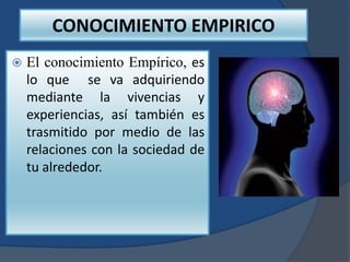 El documento habla sobre el conocimiento empírico. Explica que este tipo de conocimiento se adquiere a través de la experiencia y las vivencias. Se obtiene de manera casual a través de la vida cotidiana y la interacción con la sociedad. El conocimiento empírico se basa en la percepción y la experimentación para determinar qué existe y cuáles son sus características, pero no explica por qué las cosas son como son.