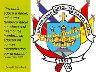 El documento describe diferentes tipos y dimensiones del conocimiento. Explica que existe el conocimiento vulgar, filosófico y científico. Luego describe las características del conocimiento científico como objetivo, racional, contrastable, sistemático, metódico, comunicable y analítico. Finalmente, explica que el conocimiento se puede clasificar según su ámbito, nivel, módulos, bases y dimensiones como la visualización, planeación, acción y soluciones.