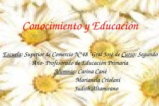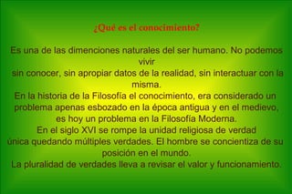 1. El documento discute el concepto de conocimiento y su relación con la educación. 2. Examina diferentes interpretaciones clásicas del conocimiento y cómo este se construye socialmente a través de la escuela y otros factores. 3. Argumenta que el currículo escolar debe equilibrar contenidos disciplinarios, interdisciplinarios y transversales para socializar efectivamente a través del conocimiento.