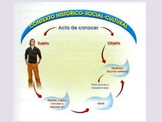 El documento describe los diferentes tipos de conocimiento, incluyendo el conocimiento del sentido común, mítico-religioso, simbólico, técnico, filosófico y científico. Explica que el conocimiento implica la relación entre un sujeto y un objeto, donde el sujeto capta propiedades del objeto y construye una representación interna. También discute las posturas del racionalismo y el empirismo sobre el origen del conocimiento.
