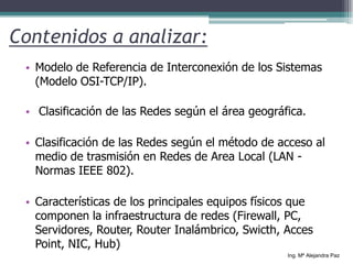 El documento describe los conceptos básicos de las infraestructuras de redes, incluyendo el Modelo OSI, la clasificación de redes según el área geográfica y método de acceso, y los principales componentes de equipos de red. Explica el Modelo OSI de 7 capas, la clasificación de redes en LAN, MAN y WAN, y los diferentes estándares IEEE 802 para LAN incluyendo Ethernet, Token Ring y métodos de acceso como CSMA/CD. También describe componentes clave de red como switches, routers, firewalls y más.