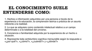 EL CONOCIMIENTO SUELE ENTENDERSECOMO: 1. Hechos o información adquiridos por una persona a través de la experiencia o la educación, la comprensión teórica o práctica de un asunto referente a la realidad. 2. Lo que se adquiere como contenido intelectual relativo a un campo determinado o a la totalidad del universo. 3. Conciencia o familiaridad adquirida por la experiencia de un hecho o situación. 4. Representa toda certidumbre cognitiva mensurable según la respuesta a «¿por qué?», «¿cómo?», «¿cuándo?» y «¿dónde?»