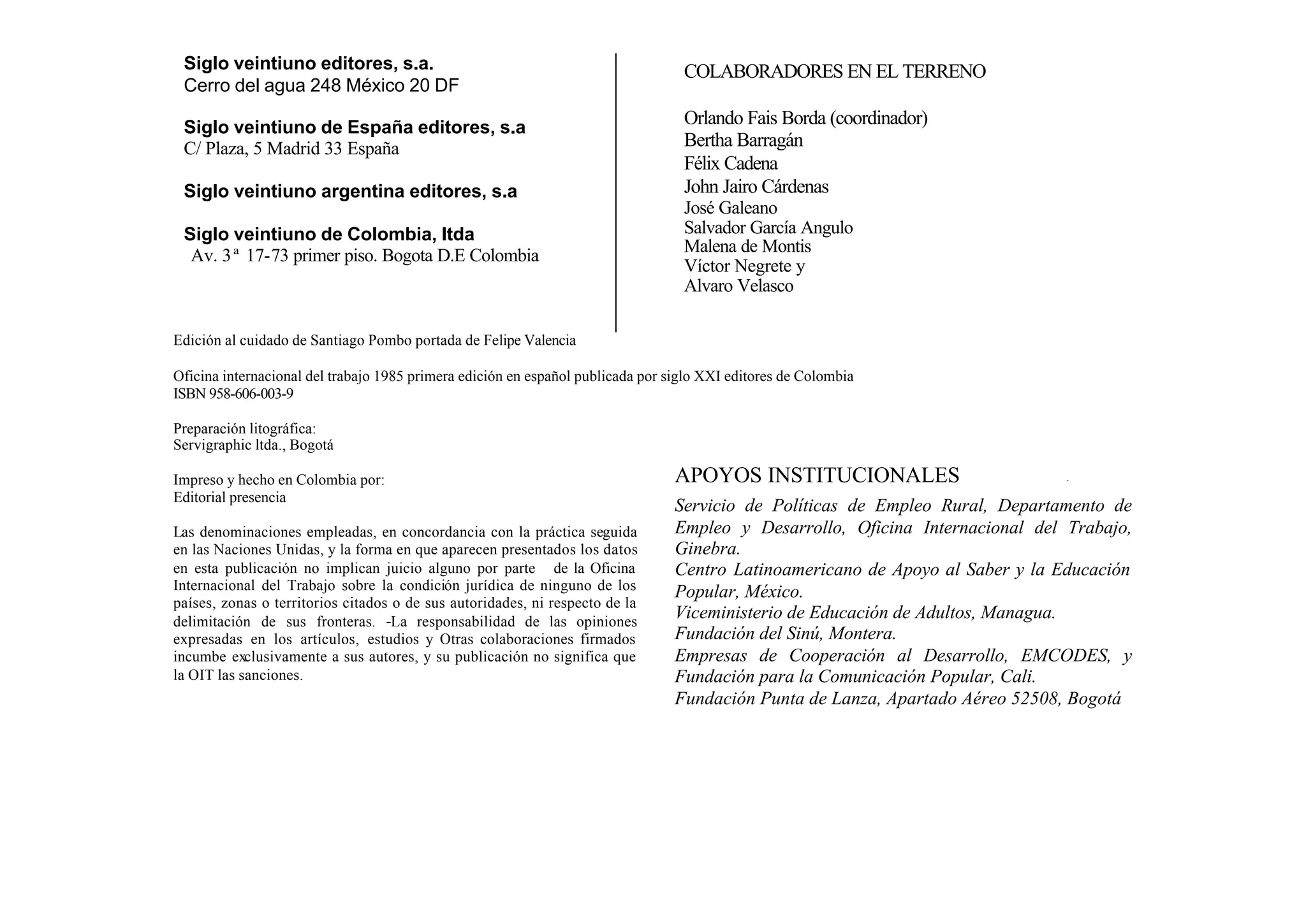 Este documento presenta información sobre colaboradores en el terreno y apoyos institucionales para un proyecto de investigación-acción participativa de la Oficina Internacional del Trabajo sobre organizaciones participativas de campesinos pobres en Colombia, Nicaragua y México. El proyecto busca contribuir al entendimiento de las clases campesinas e impulsar su participación en procesos de desarrollo a través de esfuerzos de organización propios.