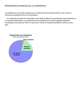 La atmósfera terrestre está compuesta principalmente por nitrógeno (78%) y oxígeno (21%), con pequeñas cantidades de argón, dióxido de carbono, vapor de agua y trazas de otros gases. La composición se ha desarrollado a lo largo de 4,500 millones de años, comenzando como emanaciones volcánicas sin oxígeno y transformándose a través de procesos como la condensación del vapor de agua para formar océanos y reacciones químicas entre el dióxido de carbono y las ro