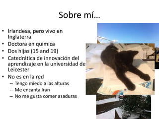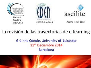 Este documento presenta una revisión de las trayectorias del e-learning realizada por Gráinne Conole, profesora de la Universidad de Leicester. El documento describe las tecnologías emergentes en e-learning como los MOOCs y el diseño de aprendizaje, y analiza cómo estas tecnologías han evolucionado a lo largo del tiempo. También discute los desafíos de la adopción de estas tecnologías, como la falta de competencia digital de los profesores, y propone enfoques como el marco de las 7Cs para mejorar el dise