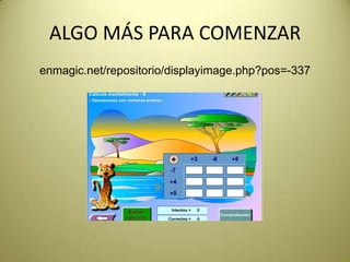 Este documento presenta una introducción a los números enteros, incluyendo operaciones básicas como la suma, resta, multiplicación y división, así como ejemplos para comprobar el entendimiento. También recomienda recursos adicionales para mejorar la comprensión de este tema fundamental de las matemáticas.