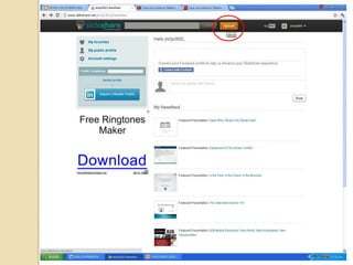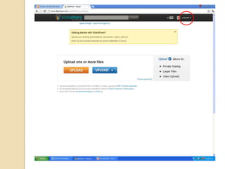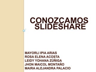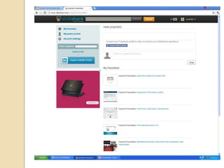 Este documento presenta SlideShare, un sitio web que permite a los usuarios subir y compartir presentaciones de diapositivas, documentos y archivos PDF. Explica cómo crear una cuenta en SlideShare, subir archivos, usar la opción Embed y salir de la cuenta. También menciona otras páginas como YouTube, Flickr y Blogger que permiten compartir videos, fotos e información.