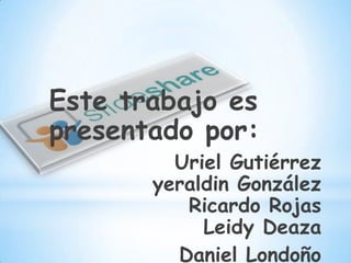 Este documento proporciona instrucciones sobre cómo crear una cuenta en SlideShare y utilizar las funciones básicas como subir archivos, acceder a una cuenta existente, usar la opción Embed y salir de la plataforma. También menciona otras páginas web que permiten subir documentos como FileDropper, MyFreeFileHosting y Scribd.