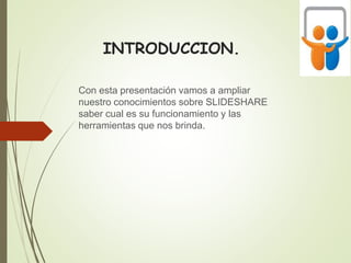 Este documento proporciona información sobre SlideShare, un sitio web para compartir presentaciones. Explica qué es SlideShare, cómo crear una cuenta, cómo subir archivos, y cómo incrustar presentaciones en otras páginas web. También menciona algunos otros sitios populares para compartir videos y fotos.