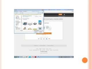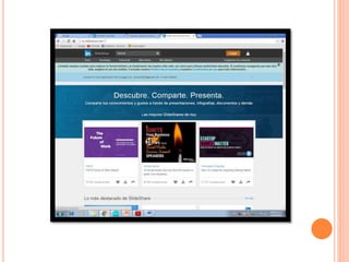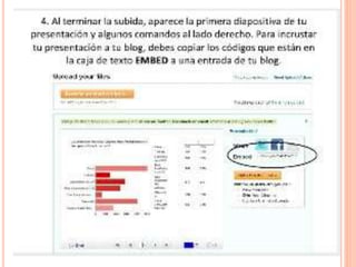 Este documento proporciona instrucciones sobre cómo usar SlideShare para compartir presentaciones en línea. Explica que SlideShare permite subir presentaciones de PowerPoint u OpenOffice y compartirlas con otros usuarios. Detalla los pasos para crear una cuenta, incluir archivos, usar la opción Embed para incrustar presentaciones en blogs, y menciona algunas otras páginas como YouTube y Flickr que también permiten compartir archivos.