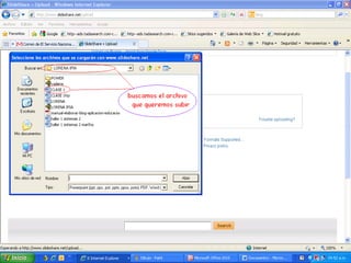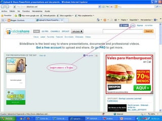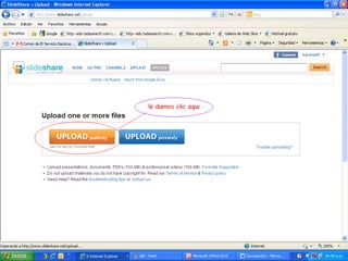 Slideshare.net es un sitio web que permite a los usuarios subir presentaciones de diapositivas para compartirlas con otros. Los usuarios pueden crear una cuenta, ingresar a su cuenta, subir archivos en formatos compatibles como PowerPoint, y luego pueden compartir los enlaces o insertar las presentaciones en otras páginas web. Otras páginas que permiten subir documentos incluyen YouTube, Google Drive y Dropbox.