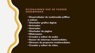 Este documento presenta la información sobre el programa de formación en diseño multimedia de María José Peñavar. Describe las ocupaciones relacionadas con el diseño multimedia, las competencias requeridas, los resultados de aprendizaje, y los criterios de evaluación. Además, explica la estructura y objetivos de los proyectos formativos que son parte integral del programa de formación.