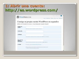 Este documento proporciona instrucciones para crear un blog y administrarlo posteriormente. Explica los pasos para elegir un dominio, título e idioma del blog, y hacer clic en "INSCRIBIRSE" para activarlo a través de un enlace de confirmación por correo electrónico. También describe cómo introducir un nombre de usuario y contraseña para acceder a la administración del blog y recuperarlos si se olvidan.