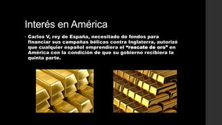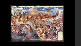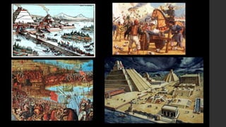 La conquista de México por Hernán Cortés comenzó en 1519 cuando llegó a la costa de Veracruz con 11 barcos, 530 soldados y 100 marineros. Cortés formó alianzas con pueblos indígenas como los totonacas y tlaxcaltecas para derrotar al imperio azteca. A pesar de la resistencia azteca, Cortés tomó la capital Tenochtitlán en 1521 con la ayuda de enfermedades como la viruela que diezmaron a los aztecas.