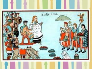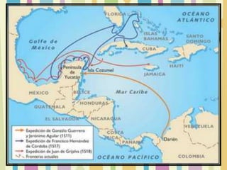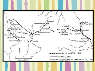 El documento describe la conquista de México por parte de Hernán Cortés y los españoles entre 1519 y 1521. Describe eventos clave como la Batalla de Centla, el uso de la lengua maya Malinche como intérprete, la llegada a Tenochtitlan, la capital del Imperio Azteca, y la reacción mixta de los indígenas a los españoles. Finalmente cubre la caída final de Tenochtitlan en agosto de 1521 después de varios enfrentamientos entre los españoles y el Imperio Azteca.