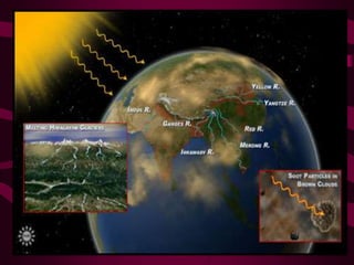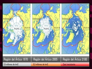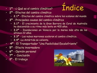 Este documento trata sobre el cambio climático. Explica que es el cambio climático, sus efectos como el calentamiento de los océanos y la acidez de las aguas. Sus principales causas incluyen el lento crecimiento de la Gran Barrera de Coral en Australia, las inundaciones en Venecia y el calentamiento de la Antártida. Finalmente, argumenta que debemos ser conscientes de nuestro impacto en el medio ambiente y cambiar nuestros hábitos para reducir los efectos del cambio climático.