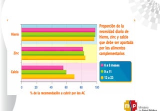 Este documento proporciona orientación sobre la alimentación complementaria para niños desde los 6 meses hasta el año de edad. Recomienda iniciar la alimentación complementaria oportunamente cuando la leche materna ya no sea suficiente, y proporcionar una dieta adecuada, segura y apropiada para la edad del niño que cubra sus necesidades nutricionales. Además, ofrece detalles sobre los alimentos y cantidades recomendadas para diferentes etapas desde los 6 hasta los 12 meses.