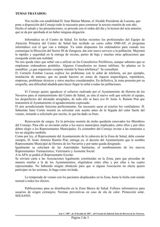 El Consejo de Salud de la Zona de Herrera de los Navarros se reunió el 18 de julio de 2007 en Luesma. Se aprobó el acta anterior y se discutió la informatización del centro de salud, el mantenimiento del edificio, la renovación de los miembros del consejo, y las necesidades de los consultorios periféricos. También se revisó la temporada de verano y las publicaciones de información para los pacientes. La reunión finalizó a las 20 horas.