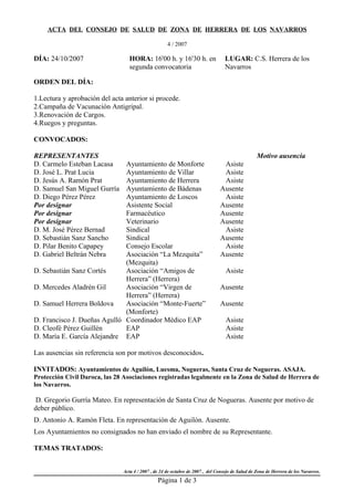 El acta resume la reunión del Consejo de Salud de Zona de Herrera de los Navarros del 24 de octubre de 2007. Se discutieron temas como la campaña de vacunación antigripal, la renovación de cargos en el consejo y el equipamiento de ambulancias y centros de salud locales. También se anunció la futura apertura de una residencia geriátrica en Herrera de los Navarros para 2009.