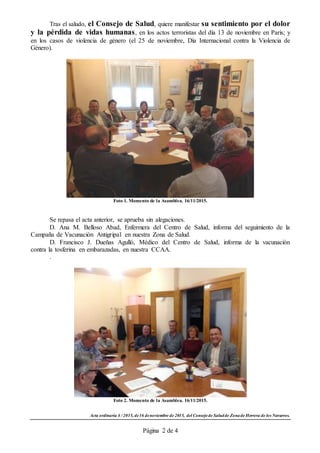 El acta resume la reunión del Consejo de Salud de la Zona de Herrera de los Navarros el 16 de noviembre de 2015. Se discutieron temas como la campaña de vacunación contra la gripe y la tosferina en embarazadas, el mantenimiento de centros de salud y consultorios médicos, y las mejoras de infraestructura como carreteras y el abastecimiento de agua. También se rindió homenaje a las víctimas del terrorismo en París y de la violencia de género.