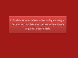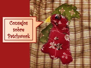 Este documento ofrece consejos sobre la técnica artesanal del patchwork, que consiste en unir pequeños trozos de tela. Explica que el término proviene del inglés y significa "trabajo de remiendo". Incluye recomendaciones sobre el corte y unión de las piezas de tela para lograr un trabajo homogéneo, así como el kit básico necesario que incluye tablas de corte, agujas y tijeras especializadas.