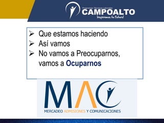 El documento presenta el informe de matrículas de 2017-2 de una institución educativa. Se informa sobre la gestión de agendados, los datos ingresados, y la meta para los próximos 26 días. También se detallan los nuevos cursos que comenzarán la próxima semana en temas como Excel básico, repostería, primeros auxilios y maquillaje. Finalmente, se mencionan brevemente las áreas de la institución como talento humano, calidad, admisiones, financiero y más.