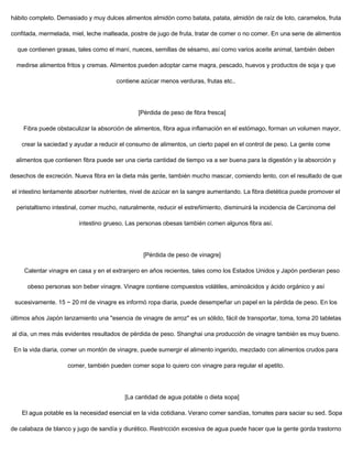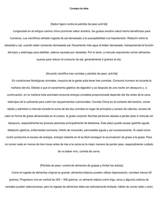 Este documento proporciona varios consejos para la pérdida de peso, incluyendo comer alimentos con menos sal y azúcar, consumir más fibra, beber vinagre, agua o sopa, comer lentamente, limitar las porciones de carbohidratos y grasas, y evitar beber café con azúcar. También recomienda comer carne magra de cerdo en lugar de grasosa.