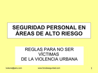 Este documento proporciona consejos sobre seguridad personal para evitar ser víctima de la violencia urbana. Recomienda mantener siempre una distancia de 20 metros con personas sospechosas, huir o pedir ayuda en lugar de enfrentar al agresor, y evitar detenerse cuando se conduce para no ser blanco fácil de un asalto.