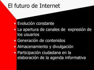 El documento habla sobre el futuro de Internet y los nuevos medios periodísticos. Describe cómo Internet ha evolucionado para permitir que los usuarios generen y compartan contenido a través de herramientas como blogs, redes sociales y participación ciudadana. También resume la película EPIC 2015 que predijo este futuro para el periodismo. Luego describe el origen de Google en 1997 y cómo se ha convertido en el motor de búsqueda dominante a través de una variedad de productos y servicios gratuitos como Gmail, Google Maps y YouTube.