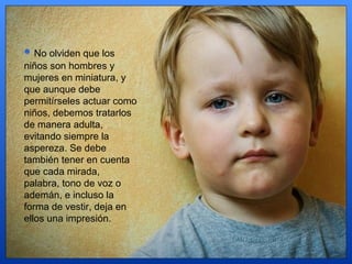 Este documento ofrece consejos sobre cómo criar niños de manera positiva, tratándolos con respeto y amabilidad. Recomienda comunicarse con ellos de forma afectuosa, establecer límites de manera consistente pero sin severidad, y enseñarles buenos valores y disciplina para que progresen.